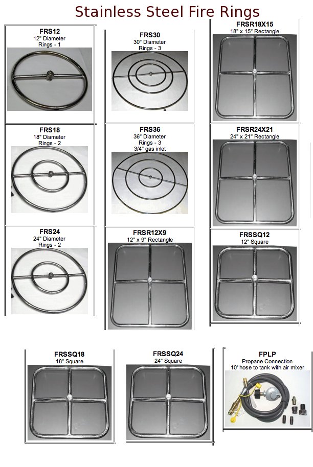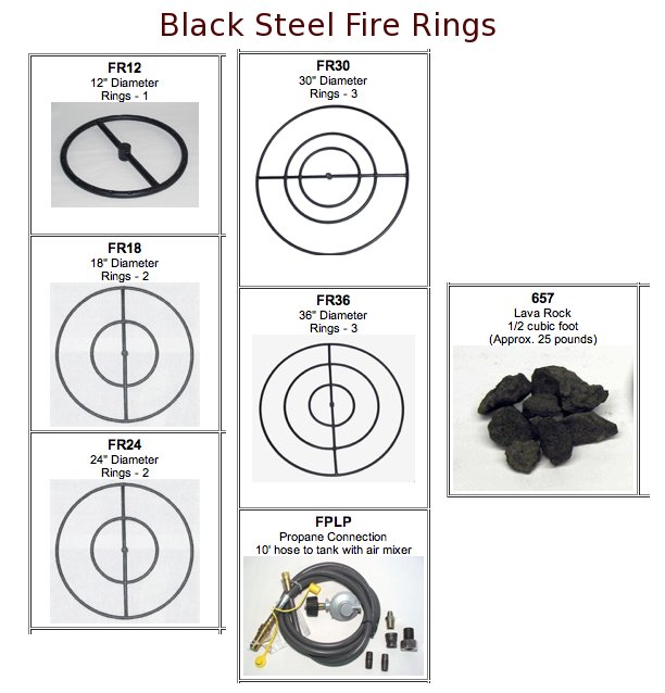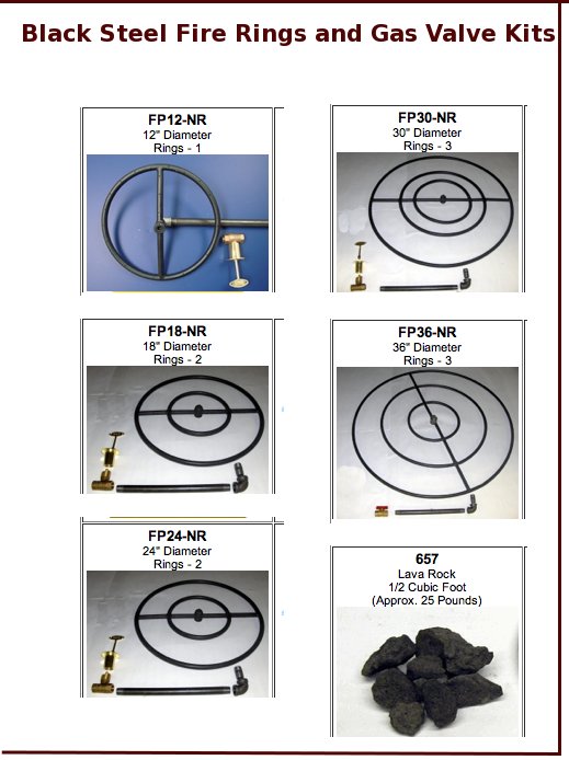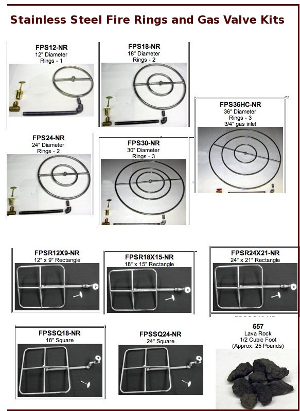 | Stainless steel and black steel fire ring kits with manual gas valve for "do it yourself" outdoor fires. Match lit fire pit kit includes everything you need to put together an in ground pit. This is a basic fire pit kit. You add the surround! Consists of: Fire ring, instructions, plumbing fittings, key valve with polished flange and key. All Fire rings have staggered burner ports for more significant and better flame pattern. Lava rock sold separate. See additional required components below for propane (LP) pits. |