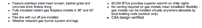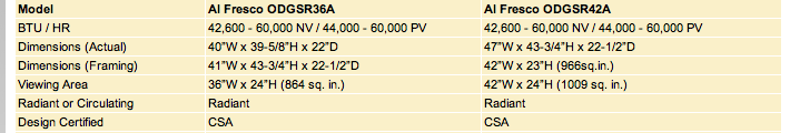 Available in gas models in both 36 and 42 inch sizes and with optional stainless steel bi-fold doors, these Al Fresco outdoor fireplaces add the ambiance of a fireplace almost anywhere from a city rooftop to a suburban backyard retreat. |