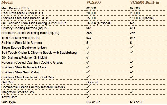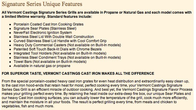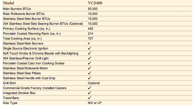 ![]() | CS400 4-Burner Gas Grill Also available in stainless or stainless and black enamel, the VCS400 is the smaller cousin to the VCS500. All of the same great features as the VCS500 but in a four burner style, the VCS400 is the perfect size for any home. Built to look great and stand the test of time, the Heritage VCS400 grill is, like all Vermont Castings grills, the gold standard in outdoor cooking. |